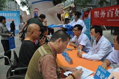 以西安新城中大耳鼻喉医院为代表的西安市17个医疗机构的200多名医务人员走上街头,为上千名市民进行健康查体和疾病宣传。